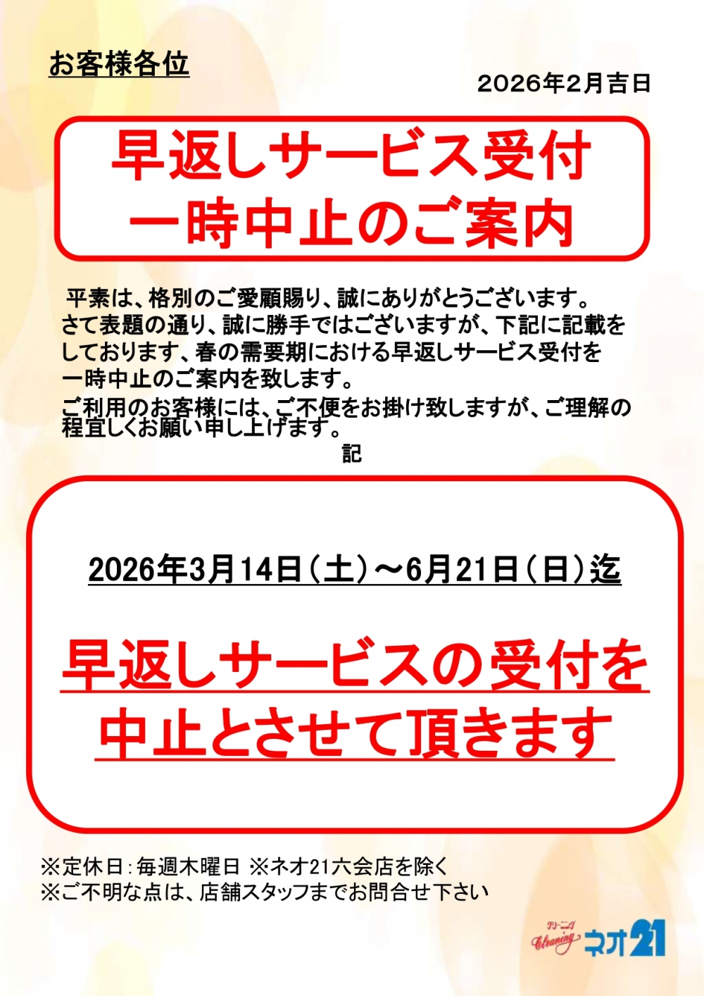 - ネオ21希望ヶ丘店 閉店のお知らせ