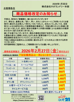 平素は格別のご高配を賜り誠にありがとうございます。 弊社は創業以来『安い・早い・きれい』をモットーに お客様に喜ばれる企業として努力してまいりましたが 、自助努力による生産性の向上や経費削減の徹底など 企業努力の限界を超える状況に至り、誠に不本意では ございますが現在の価格を見直す決定を致しました。 今後も環境の変化に柔軟に対応しながら営業を続けて いくために下記の通り商品価格を改定させていただく ことなりました。 何卒諸事情をご賢察の上、ご理解賜りますようお願い 申し上げます。